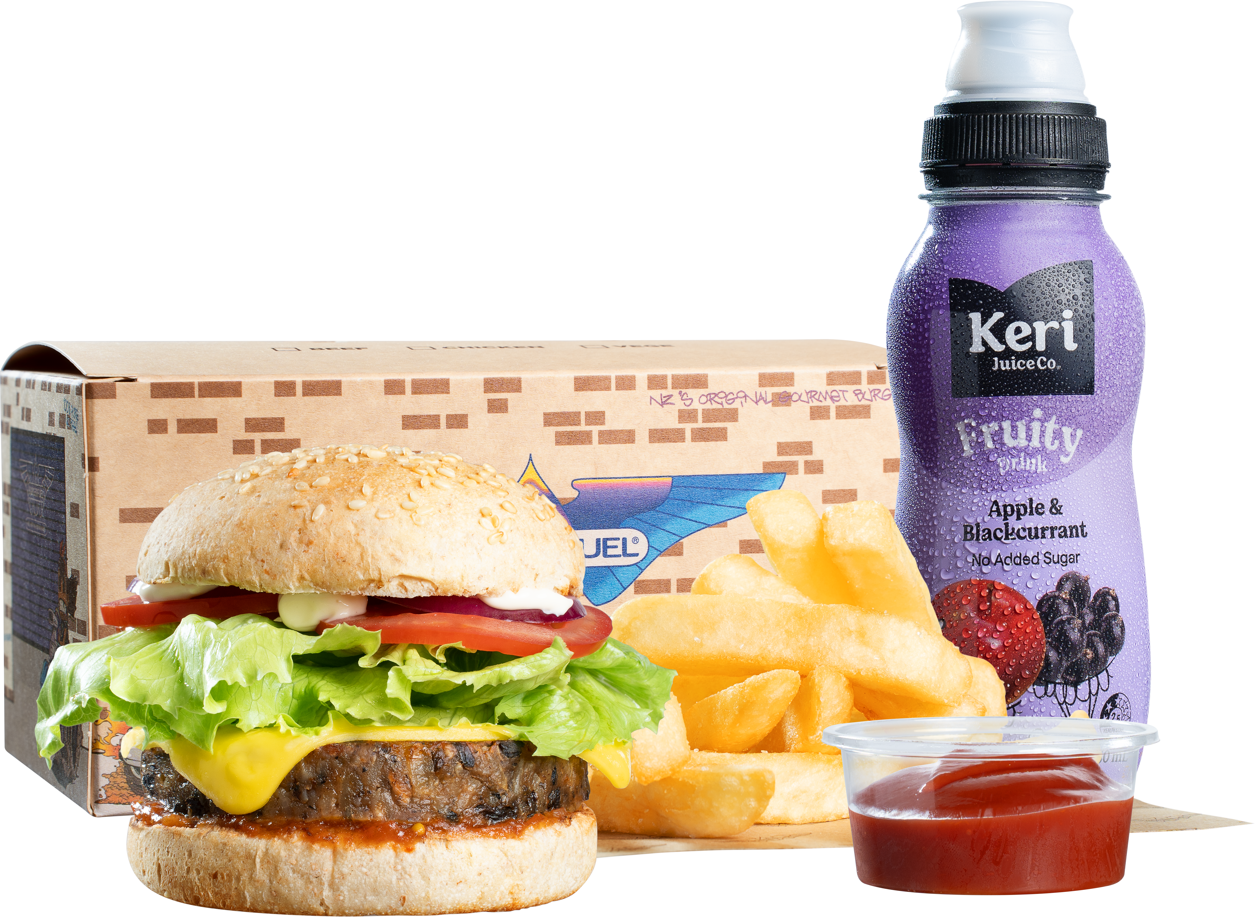 Mini bites and small size fries for mini ones and small size guys. Kids Ink. Meals served with small sized Spud Fries, free range BurgerFuel Aioli or tomato sauce, and a small juice.