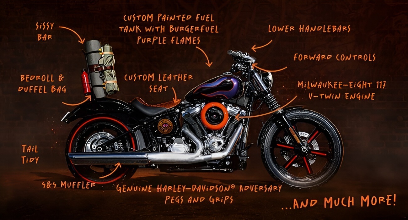 Valued at over $40K The Getaway is a Harley-Davidson® Street Bob™ Softail and features some sweet modifications listed below, plus, you'll also score a year’s worth of BurgerFuel, a subscription to Submachine magazine and Harley-Davidson® merch.